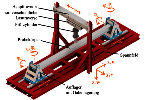 Versuchsaufbau Biegedrillknicken unter mittiger Einzellast – © Institut für Stahlbau, RWTH Aachen University